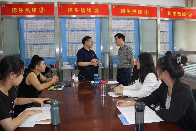 招生就业处长张永祥就我校2020年招生工作安排、招生政策宣传、招生人员培训、招生工作纪律等作了汇报。纪委书记王东晓听取汇报,现场调研,并和招生工作人员沟通交流。